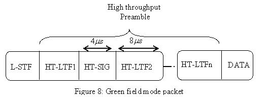El PLCP ráfaga de campo verde modo se muestra en la Figura 8. Consiste en la formación sobre el terreno corto que es idéntica a la L-STF para la adquisición y sincronización de tiempo, el HT preámbulo y la parte de datos. El HT preámbulo consta de HT-LTFs y HT-SIG. La primera HT-LTF es de 8 μ s y los restantes HT-LTFs son de 4 μ s. El propósito y el número de HT-LTFs es muy similar a los examinados en el modo mixto estructura de paquetes. El último campo es el campo de datos.